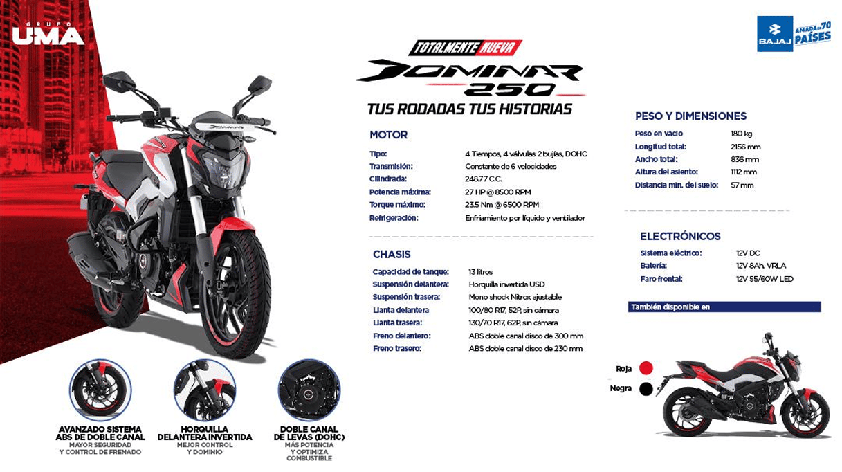 "Prepárate para redefinir el Sport Touring. La Dominar 250 te invita a explorar un nuevo horizonte de viajes, fusionando potencia, tecnología y confort en una experiencia sin igual.