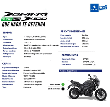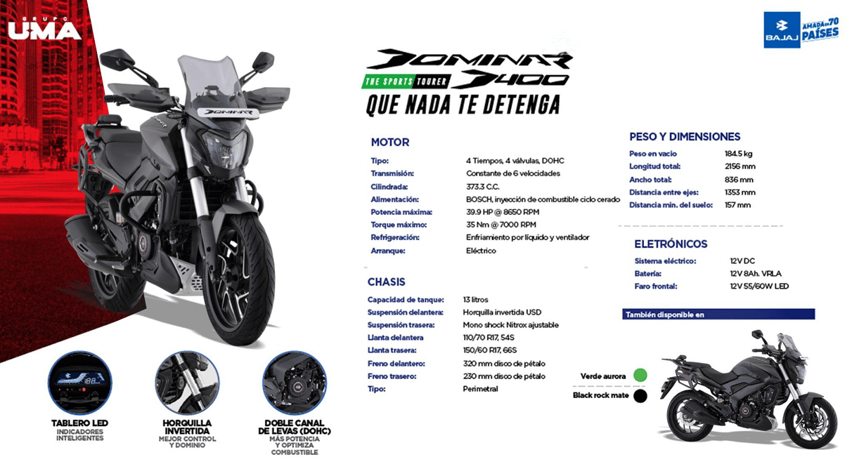 La Dominar 400: Nacida para conquistar el asfalto, creada para devorar horizontes. Esta es la Sport Tourer definitiva, diseñada para quienes exigen lo máximo en cada aventura. Su motor con tecnología DTS-i de doble chispa y Sistema Fuel Injection desata una potencia arrolladora, controlada con maestría por el sistema de frenos ABS antibloqueo y la estabilidad impecable de su horquilla invertida y suspensión monoshock Nitrox. Cada detalle, desde su tablero doble LCD y el imponente doble escape, hasta su faro de luz LED y la perfecta triangulación ergonómica, está concebido para que conquistes montañas, caminos rurales y desiertos con confianza absoluta.