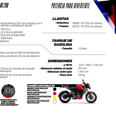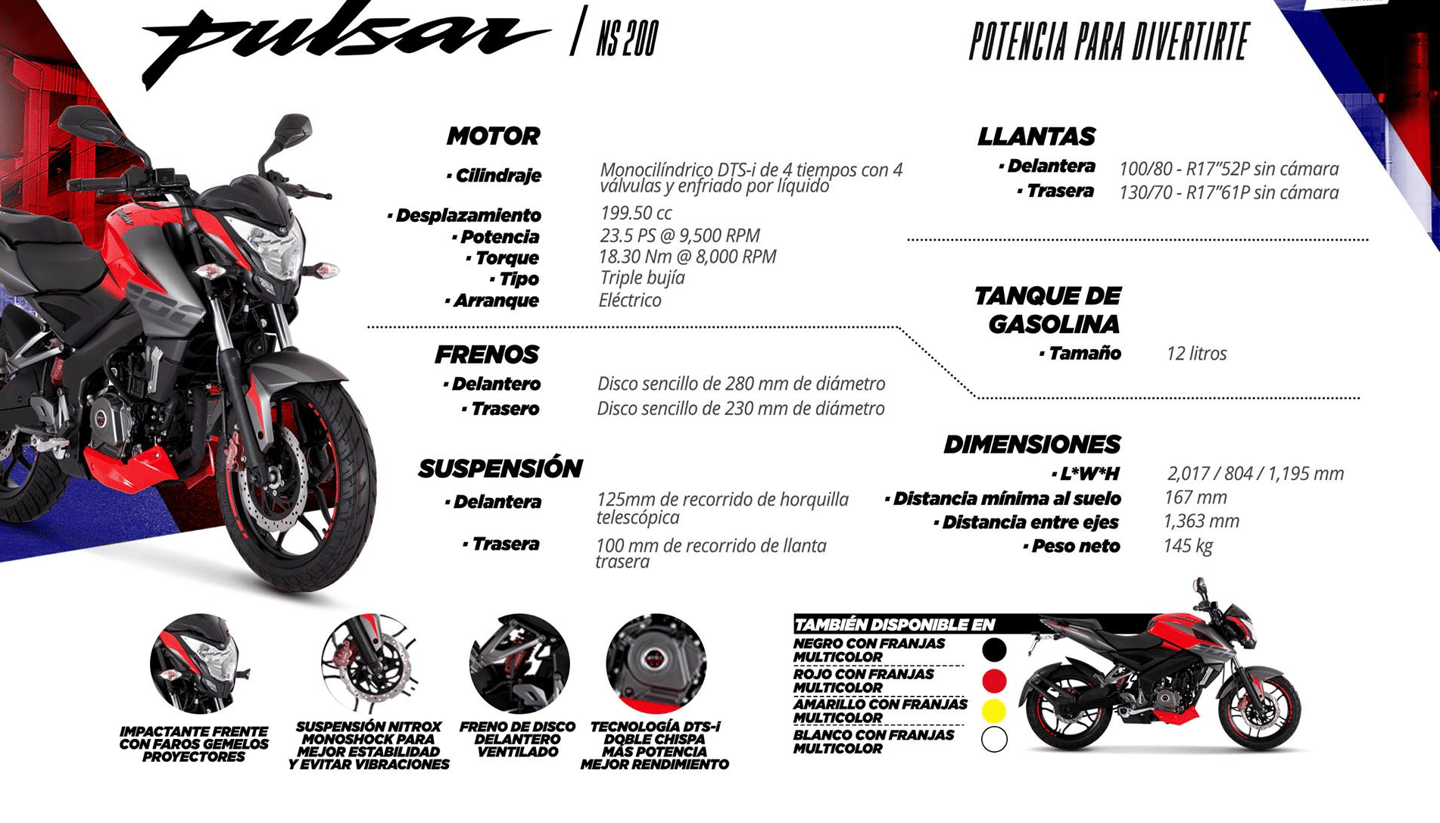 La máxima expresión del combate urbano ha sido potenciada con una amplia gama de funcionalidades. Presentamos la totalmente evolucionada Pulsar NS200, que incorpora un moderno sistema de iluminación full LED (DRLs, faros principales e intermitentes). Adicionalmente, se equipa con un panel de instrumentos completamente digital que integra conectividad Bluetooth y un avanzado sistema de navegación curva a curva.