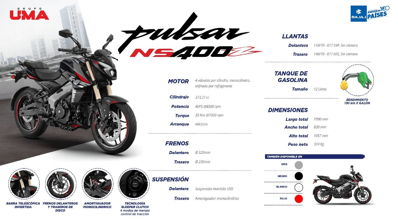 Prepárate para la evolución imparable. La nueva Pulsar NS400Z ha llegado para reinventar el segmento de media cilindrada. Con un diseño agresivo y líneas audaces que le otorgan una presencia arrolladora desde cualquier ángulo, esta motocicleta ha sido concebida para quienes no se conforman y exigen lo máximo en rendimiento, estilo y tecnología.